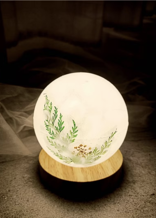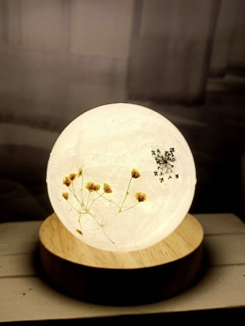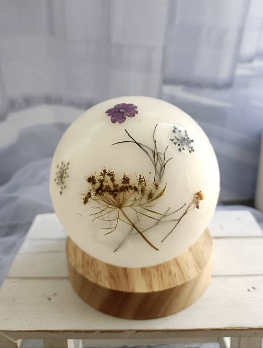 自己設計的月亮小夜燈! 用蠟製作的燈罩點綴上喜歡的花花草草,搭配原木燈座,獨一無二又實用!